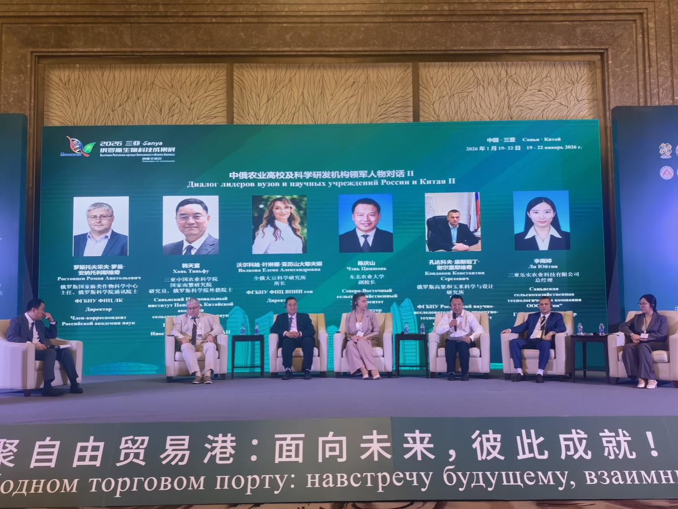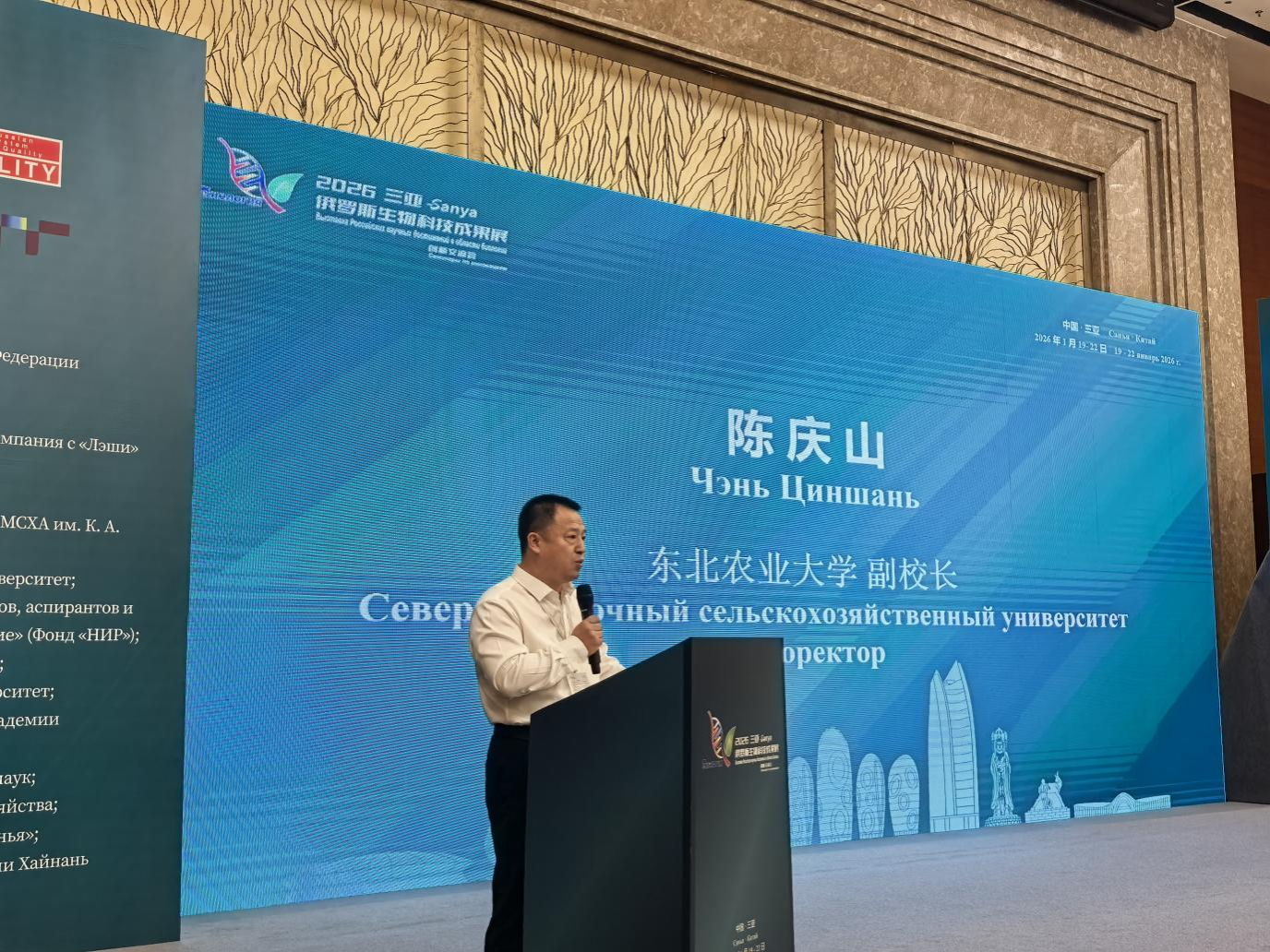 为积极服务“一带一路”科技创新行动计划,拓展高水平农业科技对外开放,助力农业领域新质生产力培育,由俄罗斯联邦农业部支持、三亚乐实农业科技有限公司主办的“2026三亚俄罗斯生物科技成果展及创新交流会”在海南省三亚市举行。交流会共有70余位俄方政府、高校及科研机构代表,以及中国农业科学院、山东省农业科学院、浙江农林大学等国内80余家单位领导专家共同出席。我校副校长陈庆山代表学校出席开幕式并致辞。科学技术处(社会科学处)处长王子龙、社会合作与成果转化中心(新农村发展研究院)主任(院长)李其林、国际交流合作处副处长迟勇、实验实习与示范中心副主任衣克寒等参会。