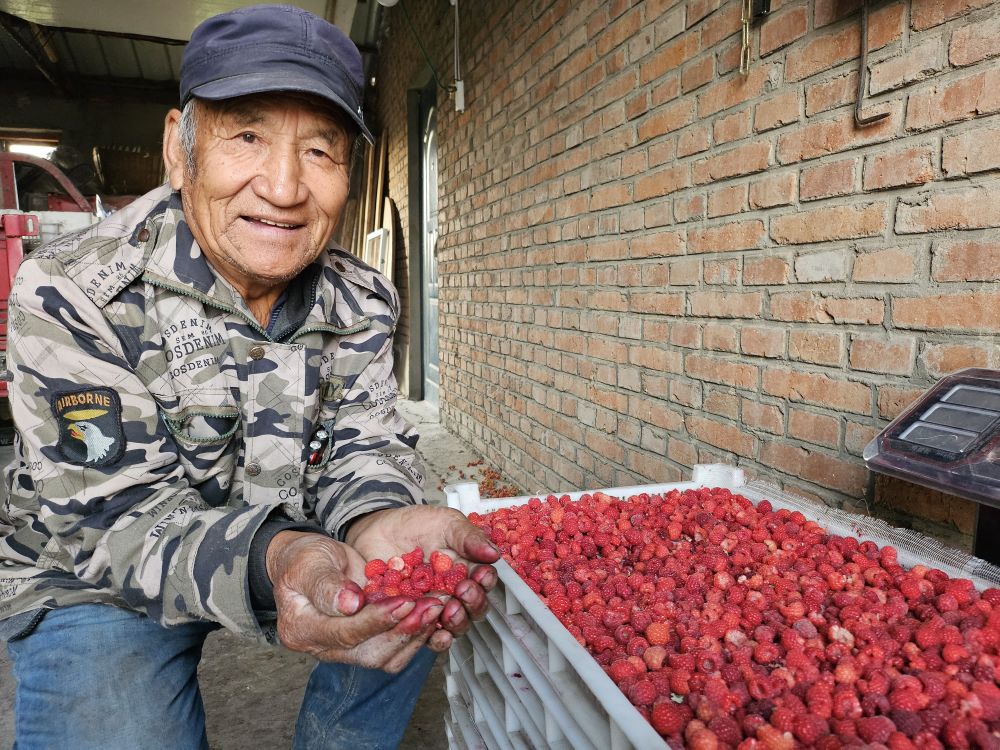 甘南县东阳镇联合村村民刘树合手捧刚采摘下来的红树莓。新华社记者张玥摄
